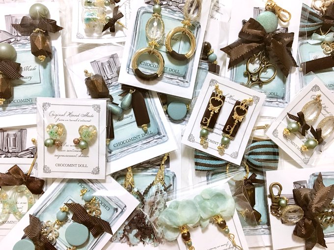 小包装まで終わりましたーーー丸一日机と向き合ってた気がする!!今回は前回と違ったデザインで沢山作りましたので、皆さんの好みにビビッとくる子が居ますように……素敵な御縁がありますように…(*´人`*) #チョコミント展2