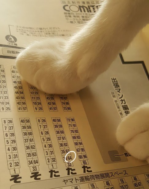 報告大変遅くなりました。 貴サークル「Rabbit's Tail」は 日曜日 西地区 ”む” ブロックー38bに配置されました。 無事入稿できました。 初めてのコミケで緊張していますが、よかったらお立ち寄りください。 新刊と既刊をご用意してお待ちしております。