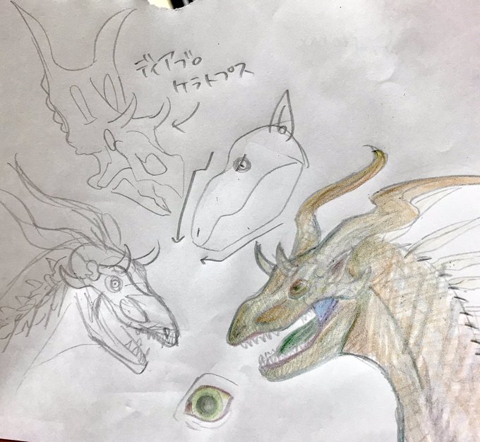 3時間クオリティの竜。 ディアブロケラトプスってかっこいいなあとか思いながら昨日夜中に描いてみた。見返すと…面影が行方不明。 #イラスト #ラクガキ #ドラゴン