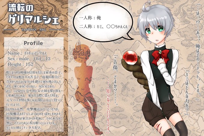 流転のグリマルシェにチャト=アングイスでお邪魔します。 ショタ(のつもり)です。ヒーラーで活動していく予定なので、お手柔らかにお願いします(*´ω`人)アイコンやカットイン等は出来次第のせていきます。 #流転のグリマルシェ_CS #流転のグリマルシェ