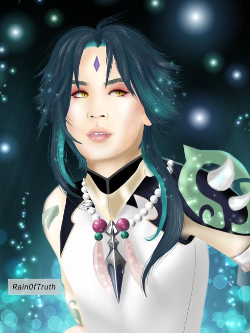 I lend 🐱's face for a semi-realistic fanart of Xiao. The first time I'm satisfied with the hair (tried out new brushes) 💙