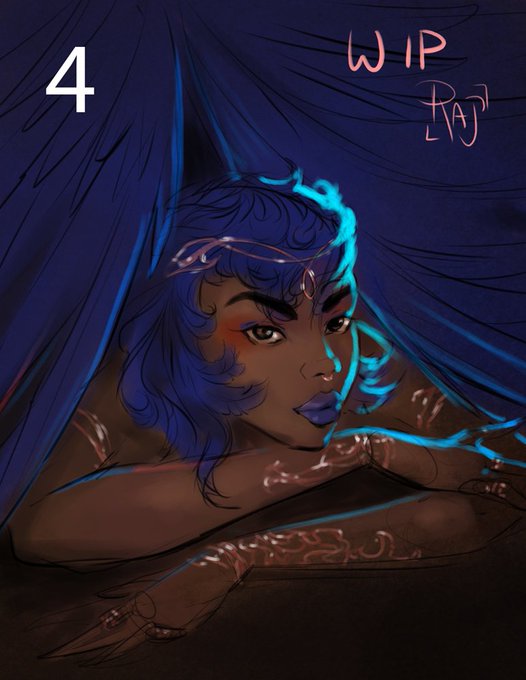 Working on a color study of a painting for a Phoenix person with blue feathers and rose gold, deciding between lighting setups. There's gonna be a poll incoming so get ready to throw in a vote.