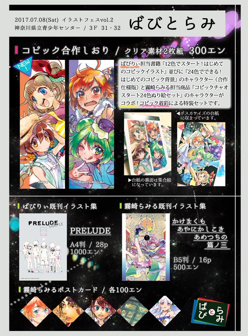 明日、ばびりぃさん(@babiry_moob)と合同参加するイラフェスのお品書き+新作グッズのサンプル画像追加です!モーメントに過去のツイートもまとまっておりますのでご覧ください。