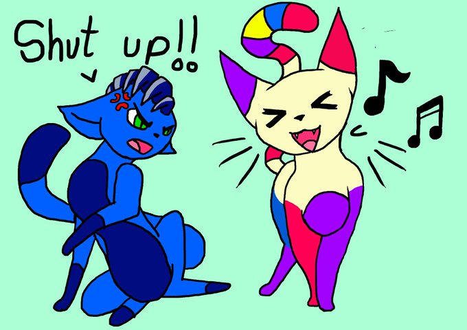 Quick pic of mine and my friends fursonas. She is yelling at me to stop me of key singing.