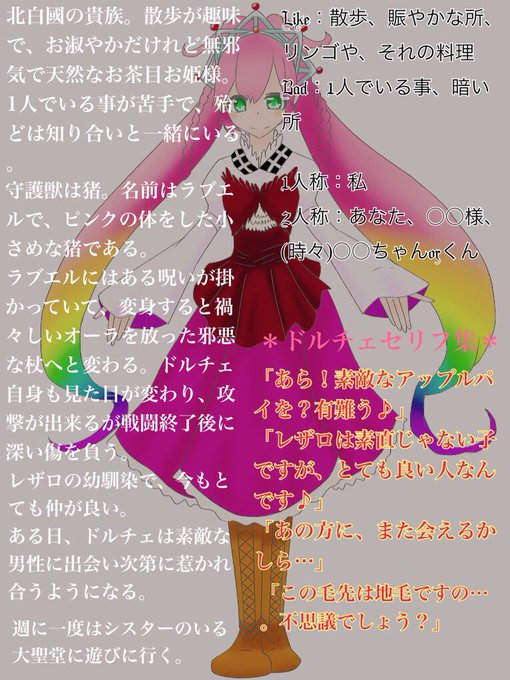 恐らくこれが最後のキャラシ投下です!長かった〜〜 10人目、北白國の貴族!ドルチェをどうぞ宜しくお願いします♪ #剣と魔法と守護獣 #けんましゅ #北白國