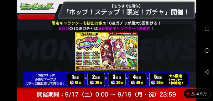 もうすぐ9周年だからプレイバックガチャとステップガチャが来るわねっ♪新しい難易度として超究極・彩が来るみたいねっ🍎