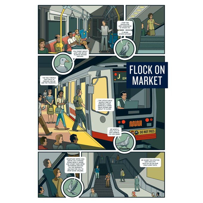 Peter & Maria Hoey @coinopbooks were commissioned by @SFAC and @SFMTA_Muni to create 6 large-scale #comics to be installed at bus kiosks along Market Street. The comics tell stories of the everyday lives of people — and one pigeon — at the Market Street crossroads.