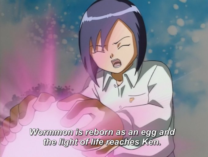 After the incidents Ken is thoughtful, feeling empty as if he no longer has his heart. This only changes later when he repents of his sins and finds Wormmon's Digitama that when is reborn touches Ken with the "light of life.