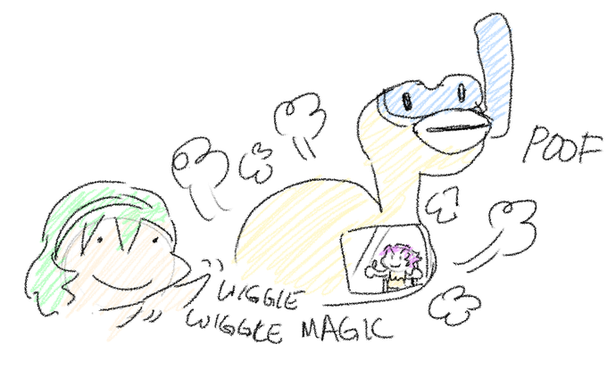 Fae sat down for an icecream break, but the evil villian Veronica snatched her icecream away! HELP ME ALMIGHTY green hairs! And with the power of friendship and OP Nino summoned the SCUBA DUCK M2K! @kenzaki813 @Nohri_