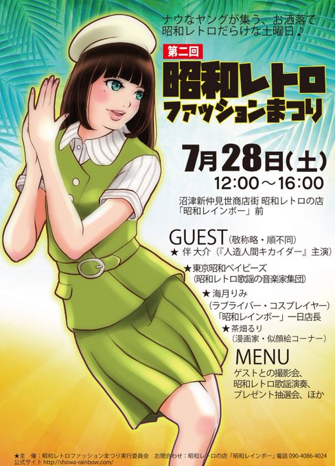 【第2回 #昭和レトロファッションまつり 開催!】7月28日(土)12~18時 #沼津新仲見世商店街 #昭和レインボー 前。ゲストは『キカイダー』主演 #伴大介 さん、海月りみ一日店長ほか。撮影会やプレゼント抽選会などを楽しもう♪