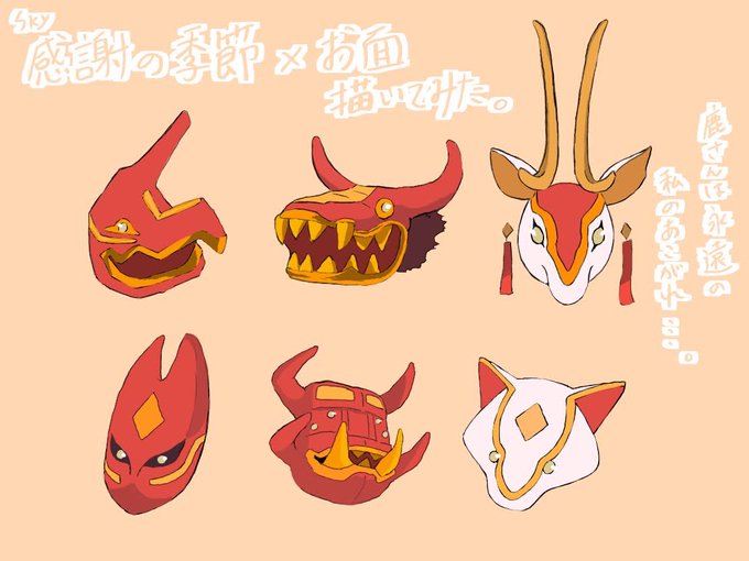 感謝のお面のデザインがとてもすき。 少しずつまた絵を描いて載せていこうかな... #sky星を紡ぐ子どもたち