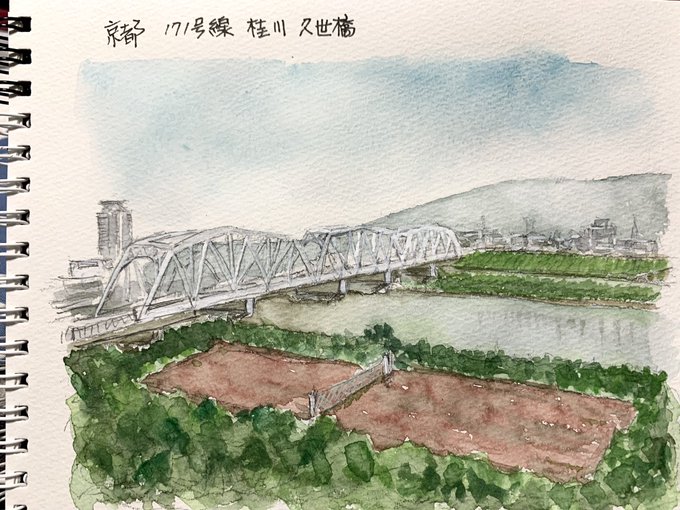 2021-10-26[火] #京都 #桂川 にかかる大きな #久世橋 。京都と兵庫県 西宮を一直線で結ぶ国道171号線を支えている。日本電産の本社ビルがやたらデカい。桂川左岸から西山、天王山を背景に。 #花野新作2021 #ご近所シリーズ #想いを描く #花野の絵履歴 #風景画 #スケッチ #水彩画 #watercolor