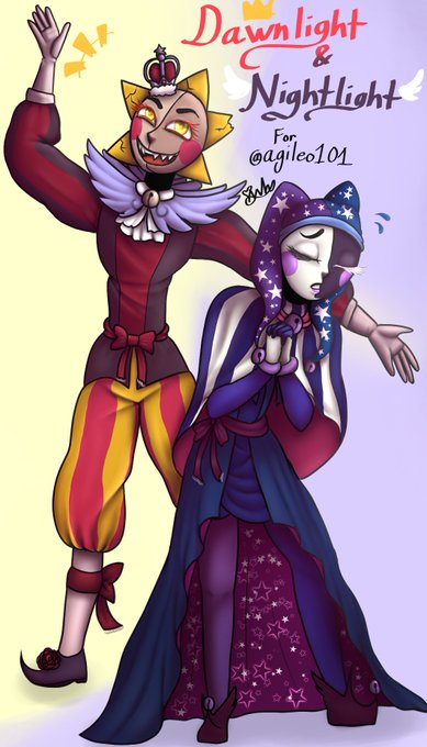@agileo101 - As more of a thank you for letting my curious Moon roam and not outright banning him from the daycare- Here's some proper fanart of your Dawn and Night! Hope you like it! #Moondropfnaf #Sundropfnaf