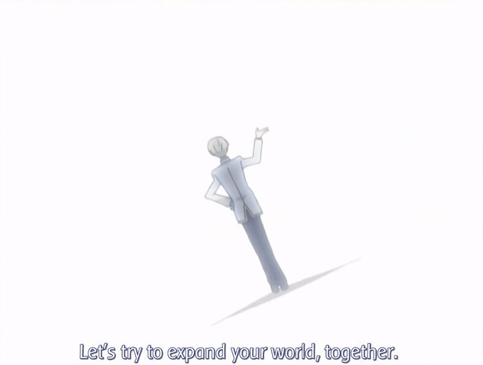 Tamaki offers them a whole new world in order to find someone who will eventually differentiate them. This whole new unknown world as shown by the excess amount of white in the last shot here, is a new world where the twins can find color and happiness.
