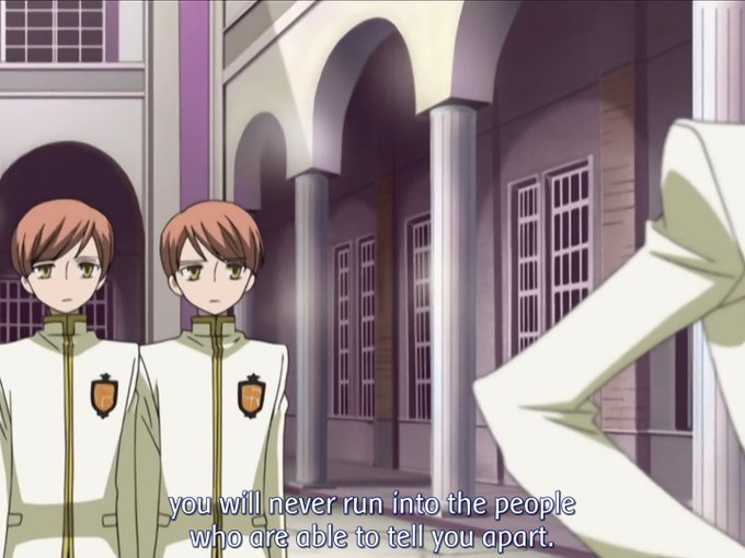 There's reflective imagery here as they explain to Tamaki how he has one month to figure out who is Hikaru and Kaoru with an explanation, saying it as if they know it's impossible yet flipping the image represents how they desire the opposite, the impossible to be possible.