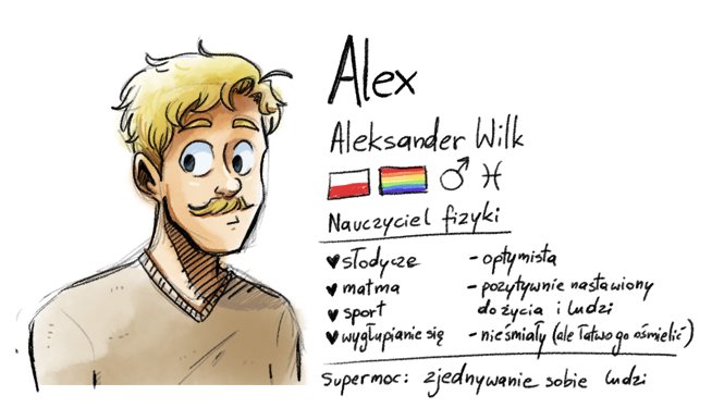 @Snixen121 ;w; oczywiście, że opowiem! Alex jest uroczy i kochany, jest chodzącym cynamonowym bułeczkiem. Chociaż pewnie jakby o tym wiedział, to zacząłby zjadać sam siebie, bo uwielbia ciastka. Jest trochę niemądry, ale nadrabia pozytywną energią i zapałem. 🤔 w sumie taki golden retriever