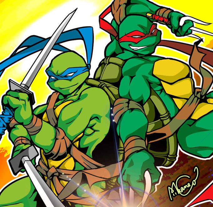 【亀】1日1枚お絵かき12日目兼 #TMNT版深夜の真剣お絵描き60分一本勝負 ①レオナルド ②ミケランジェロ ⑥2k3(新亀)