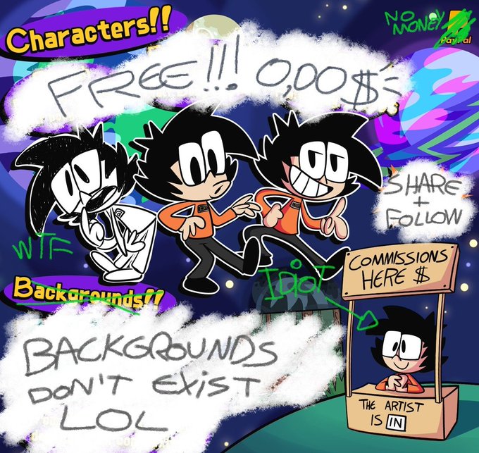 Hey guys, I just realized that I don't like money anymore, is just green paper with dead people in it so I'll now make commissions for free, just share, follow me and comment what you want me to draw here and I'll do it (just for today)