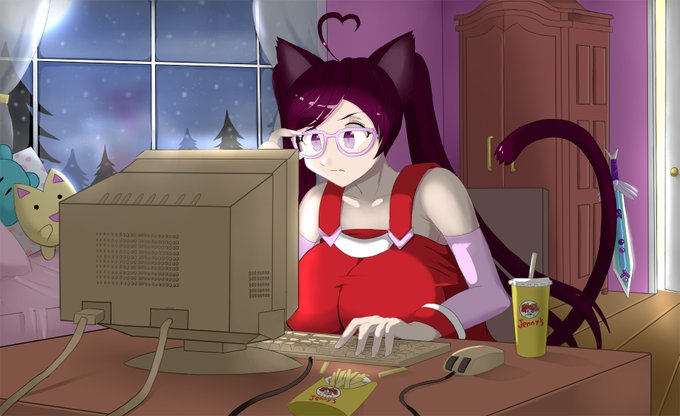 Picture I made for @SaraJLeen's game development streams! A nice cozy winter night, programming at stupid o'clock in the morning, eating some Jenny's.☺️