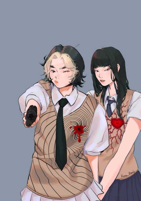 My two oc Heon (with blond bangs) and Sawa (long hair) #oc #originalcharacter #procreate #schoolgirloutfit #art