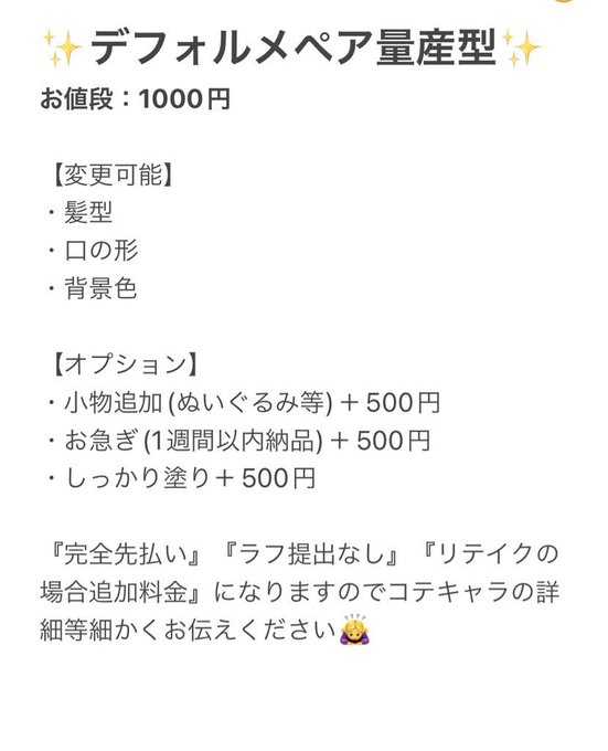 量産型デフォルメメニューでしたら1000円〜ご依頼可能ですのでよければ御検討ください😊