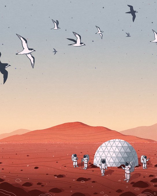Art by @christinaillos for @Artetorial inspired by work done over at HI-SEAS where they conduct simulations of life on Mars. She captures the isolation of an unknown environment yet we are intrigued by the familiarity of the Hawaiian birds bring us back down to Earth. #rsar_group