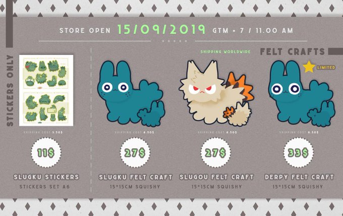 Slugku merchs going to be available on 15/09/2019 GTM+7 11.00 AM via Storenvy! they shipping worldwide too🥰