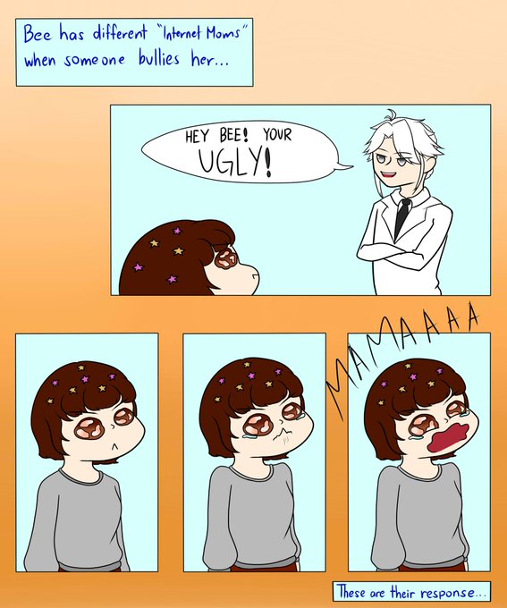 This is how three or Bee's Internet Moms reaction on her being bullied XD comic version. I finally finished it but its a bit wonky since ive rushed it. But its done, shout out to @selenium_ch @blEph_ @BeeeeKrazy and @BaniraMikii (bully mi child again and i will fight u XD)