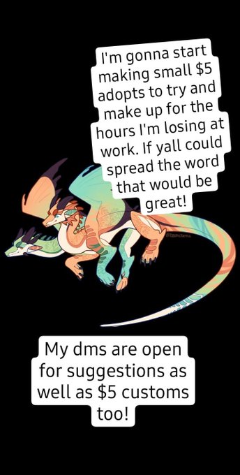 Hey guys. So as stores are closing for the virus, and my hours being cut, I'm no longer making enough money to pay my bills. So I'm gonna open commissions for just $5 or whatever you can pay. Since I know times are tough now for everyone. Any shares would be greatly appreciated.