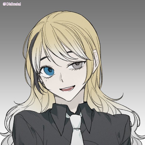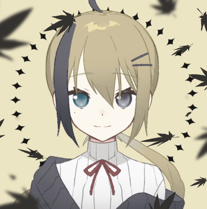 長髪の一括りに黒の右側メッシュ、右青眼左黒目のオッドアイです!右目に泣きぼくろ!