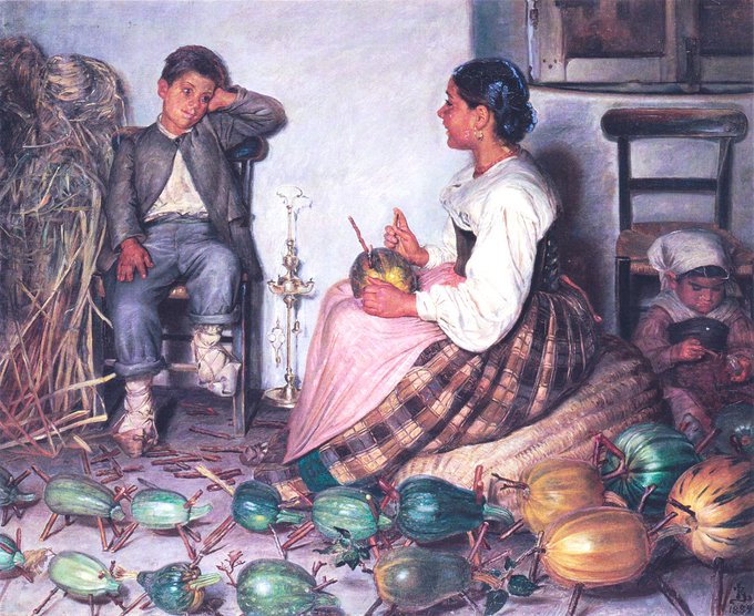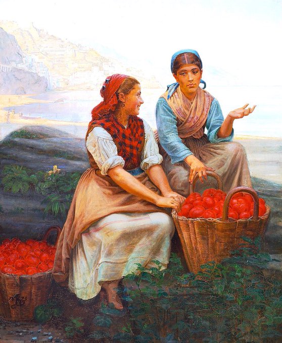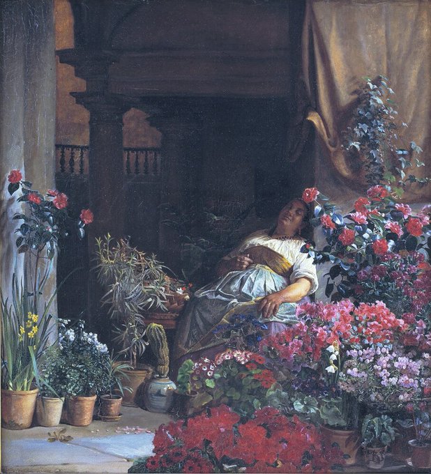 The artist left for Italy in 1875 & fell in love with the country, returning regularly & imbibing the colours of the South. Italian Girls with Tomatoes (1878-9), Flower Seller, Florence (1880) & Interior of the Last Century (1881)