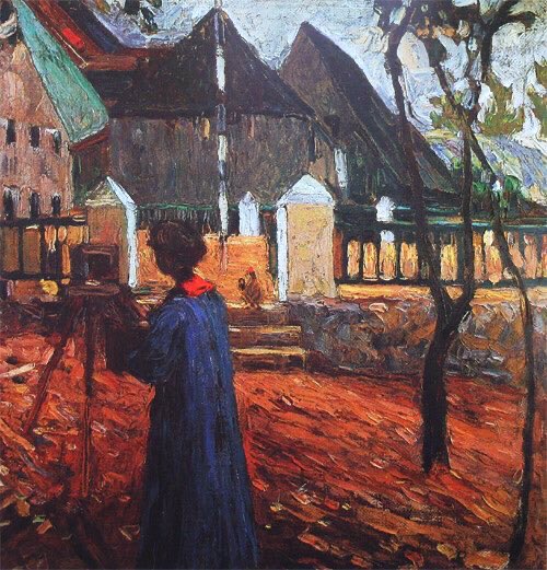 By 1908 she distilled the ideas of Fauvism into her work. Brighter colours & a more impassioned approach characterised her work. She bought a house & settled in Murnau. Blue Mountain (1908), Von Werefkin (1909), Self (1909) & Winter (1909)