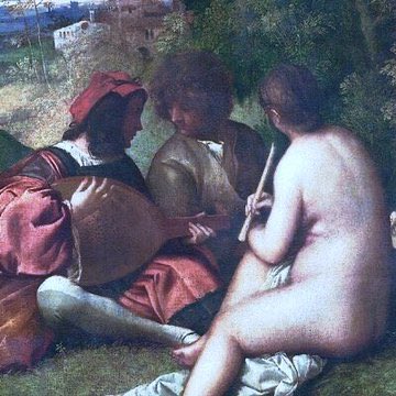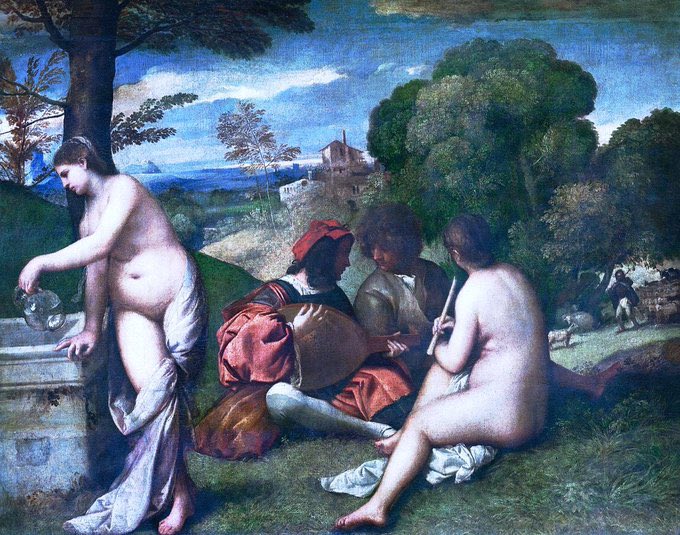 Fête Champêtre* (possibly with or by Titian, 1508-9). Both Titian & Giorgione were associated. Some claimed he was Titian’s master, others that they were fellow students. However Titian’s early work is derived in part from Giorgione. Their closeness is best shown in this work