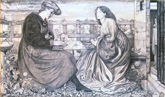 Here are his drawing of the Backgammon Players (1861) & watercolours of Merlin & Nimue and Fair Rosamond & Queen Eleanor (both 1861). Stories of Arthurian Legend would be a life long interest