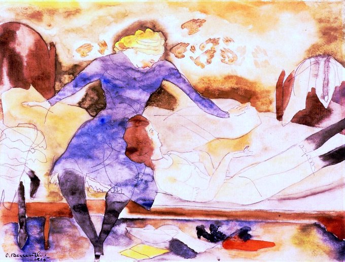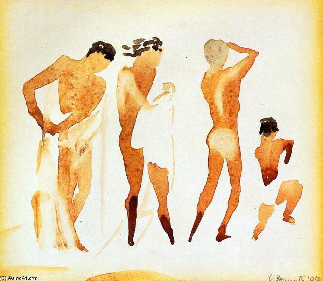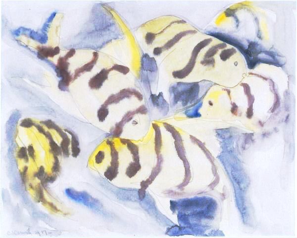Demuth created a series of exquisite watercolours of fish (unfortunately I couldn’t find any well photographed examples). Nana visiting her Friend Satin (1915), Bathers (1916) & Fish (1917)