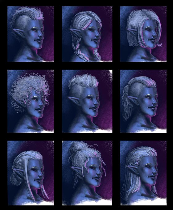 New head new hairstyle options. I doodled the rough sketches for most of these while sitting at my booth in slow moments during a comic convention. Then came home and made prettier versions of all the hairstyles I'd seen.