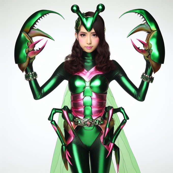 #dalle3 #dalle3art カマキリ女怪人。補色にピンクを入れるのがポイント。 大chatGPT時代、大DALL-E時代ではどんどん陳腐化するかもしれないけど、とりあえず顔出し着ぐるみ女怪人載せれるうちは載せます。絵だけでなくなんかストーリーが欲しいですね。