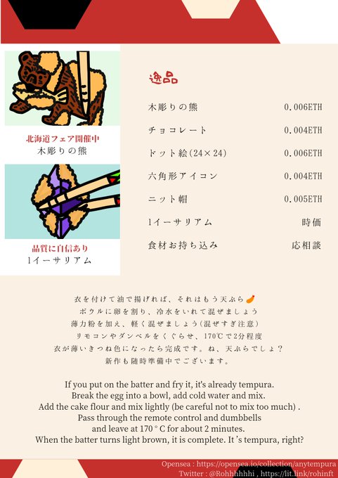 @DoodleJackNFT Break the egg into a bowl, add cold water and mix. Add the cake flour and mix lightly. Pass through the remote control and dumbbells and leave at 170 ° C for about 2 minutes. When the batter turns light brown, it is complete. It ’s tempura, right?