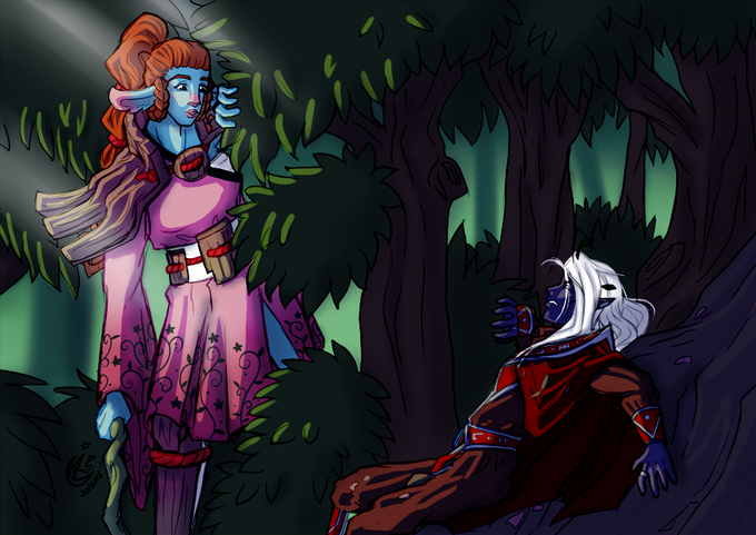 A dark elf escaping from an angry mob and a druid taking a stroll met.