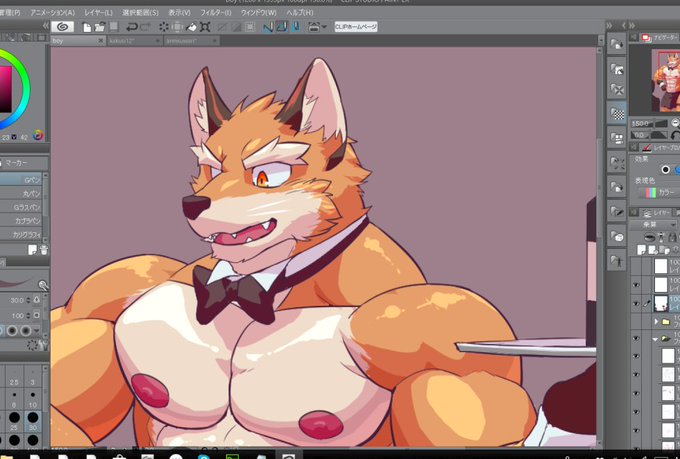 裸ウェイター狐さん描いてる途中です。