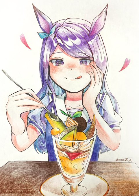 #瀬名のイラストぎゃらりー #ウマ娘プリティダービー #色鉛筆 #メジロマックイーン 函館のメロンパフェをパクパクするメジロマックイーン