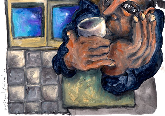 "hombre con vitral" 42 x 52 cms. collage, tintas, café y otros sobre cartón