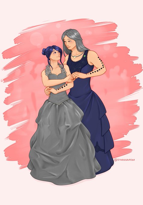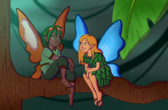 @MicheleQuirke @WinterMaiden11 I've got art of fluff moments from future stories. Firstly, there's Yaetherim and Naeliya (fairies) sharing a moment in the forest together. (Art by @BoneJanky). Secondly is Karis and Tenora at the Jacaranda ball, realising that they're actually in love. (By Isa Franco)