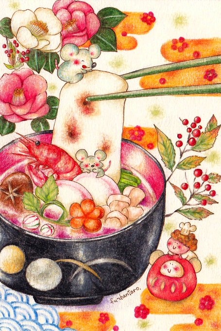 お雑煮カキカキ🎍 #イラスト #色鉛筆 #まだ途中