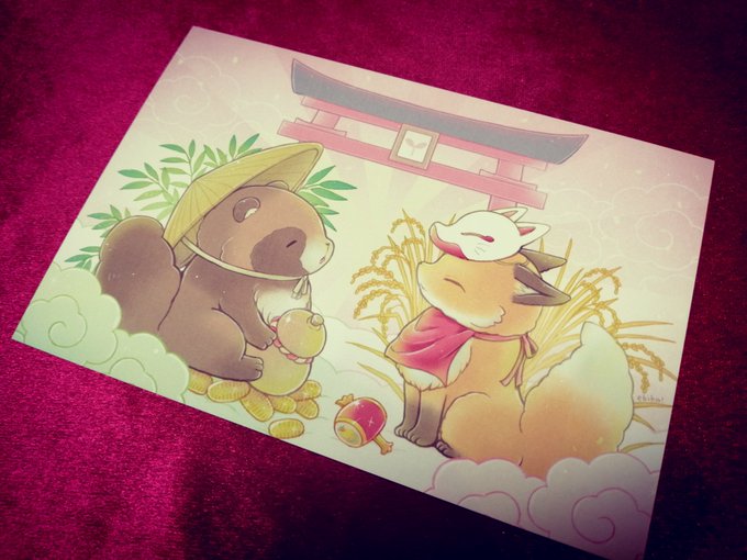 メイン作品は『たぬきつ祭り』!狐さん、狸さんだけでなく、沢山のエコペンちゃんたちが実りのお祭りを盛り上げているめちゃくちゃ可愛い作品です!!メイン作品はポストカードでもお迎えできます。ebika!さんの狐さん狸さんも可愛いのです!