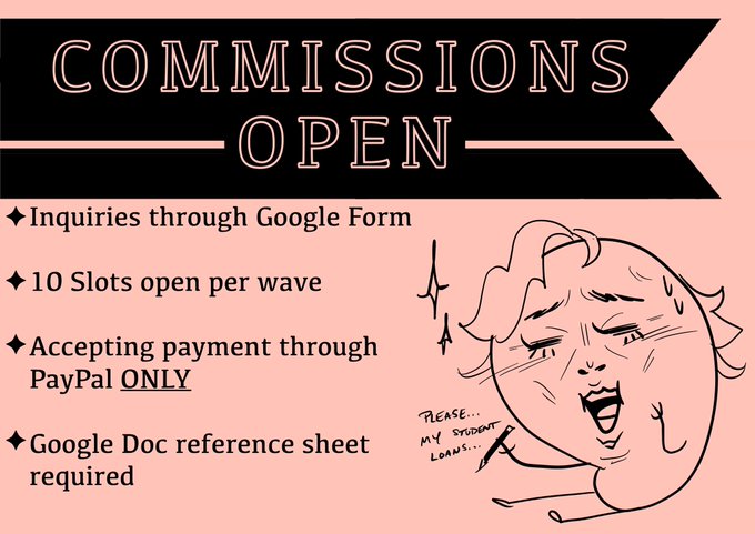 Hello! I'm opening commissions and will ONLY be taking inquiries through this google form. Before filling it out, please create a google doc with a few reference/details of what you're looking for! Max 10 slots open per wave. Here is the link: