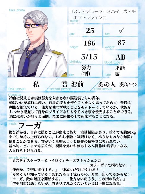 団員名簿⑰[@sirasu_tnk ]宅 ロスティスラーフ・ミハイロヴィチ・エフトゥシェンコ︎︎☁︎︎フーガ