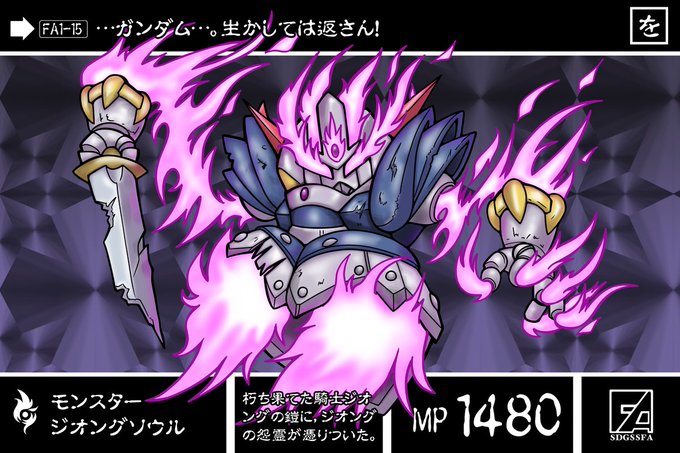 大昔騎士ガンダムに倒された,騎士ジオングの朽ち果てた鎧にジオング本人の怨霊が憑りついたモンスター。なぜか,生前より強い力を持っている。宙に浮き,自由自在の攻撃を仕掛けてくる。