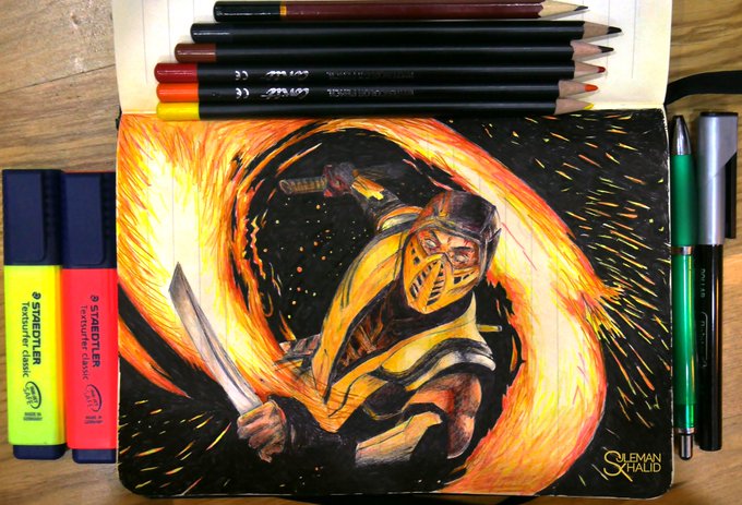 Replying to @MKMobileGame. Here's my scorpion Interpretation, made with ink and colour pencils. #scorpion #mk11