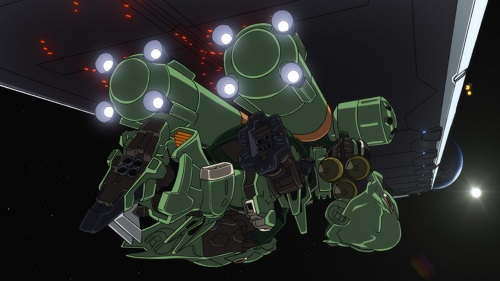 設定画ではモノアイがそのまま残されているように見えますが、劇中の画像を見ると、メインカメラユニットにジェガン系パーツが使われているのがわかると思います。